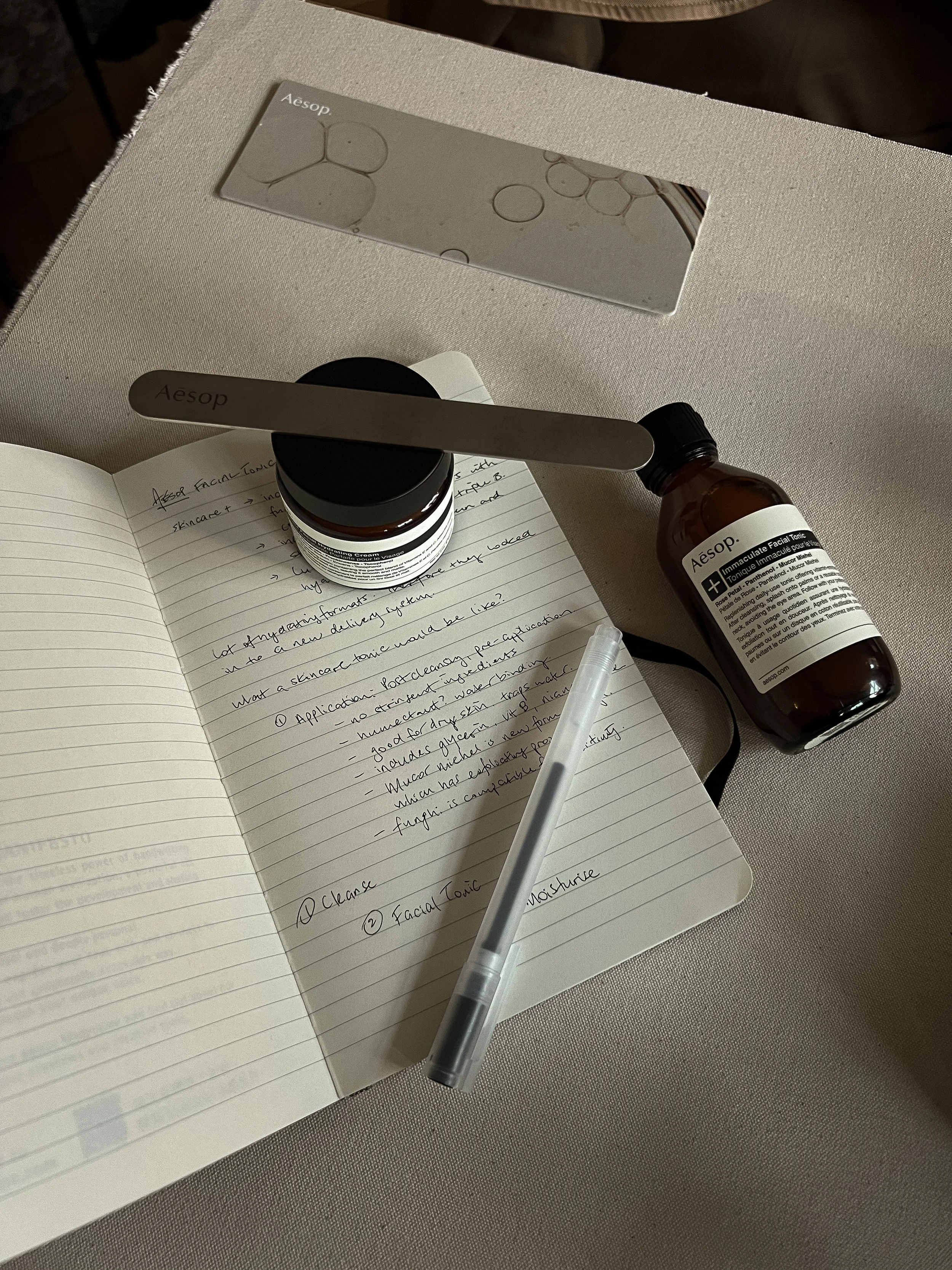As the evening progresses, the mood shifts gently from studious to convivial. Dinner unfolds within the canteen’s understated interior, where simple plates and seasonal ingredients encourage guests to linger. The transition feels natural, moving from learning to shared table. In a landscape often crowded with noise, Aēsop’s Immaculate Facial Tonic arrives as a quiet, deliberate extension of the Skin Care+ line, thoughtful in both form and intent.