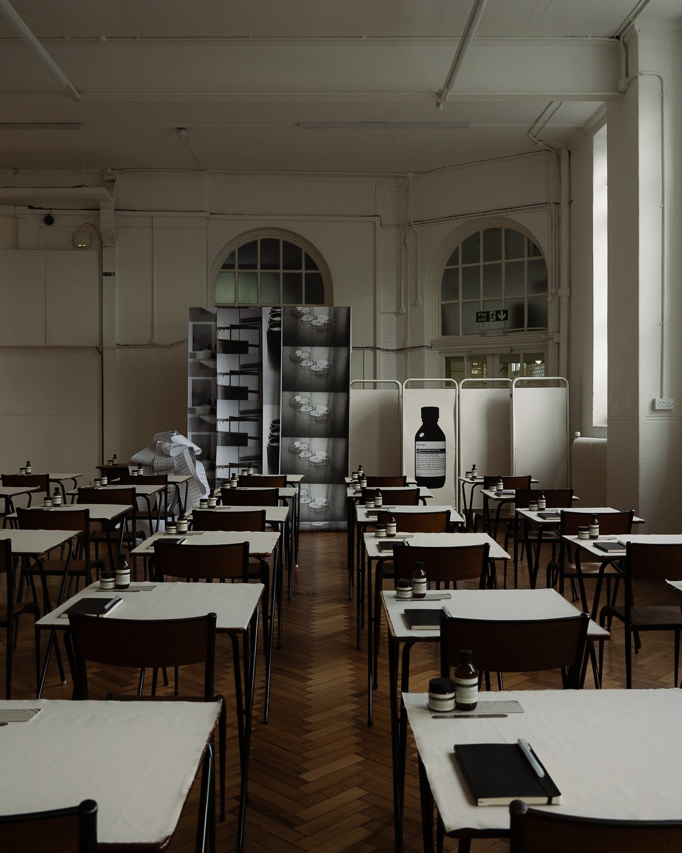 Evening settles softly over east London as guests arrive at Rochelle Canteen, the space momentarily transformed into something between classroom and quiet laboratory. For the launch of its latest Skin Care+ addition, Aēsop leans into what it does best: considered ritual, intellectual framing, and an atmosphere that privileges restraint over spectacle. The setting is deliberately studious, with rows of pared-back desks precisely arranged with notebooks, glassware, and the brand’s unmistakably minimal bottles. Soft light washes the pale walls while the herringbone floor grounds the installation in something warmly familiar.