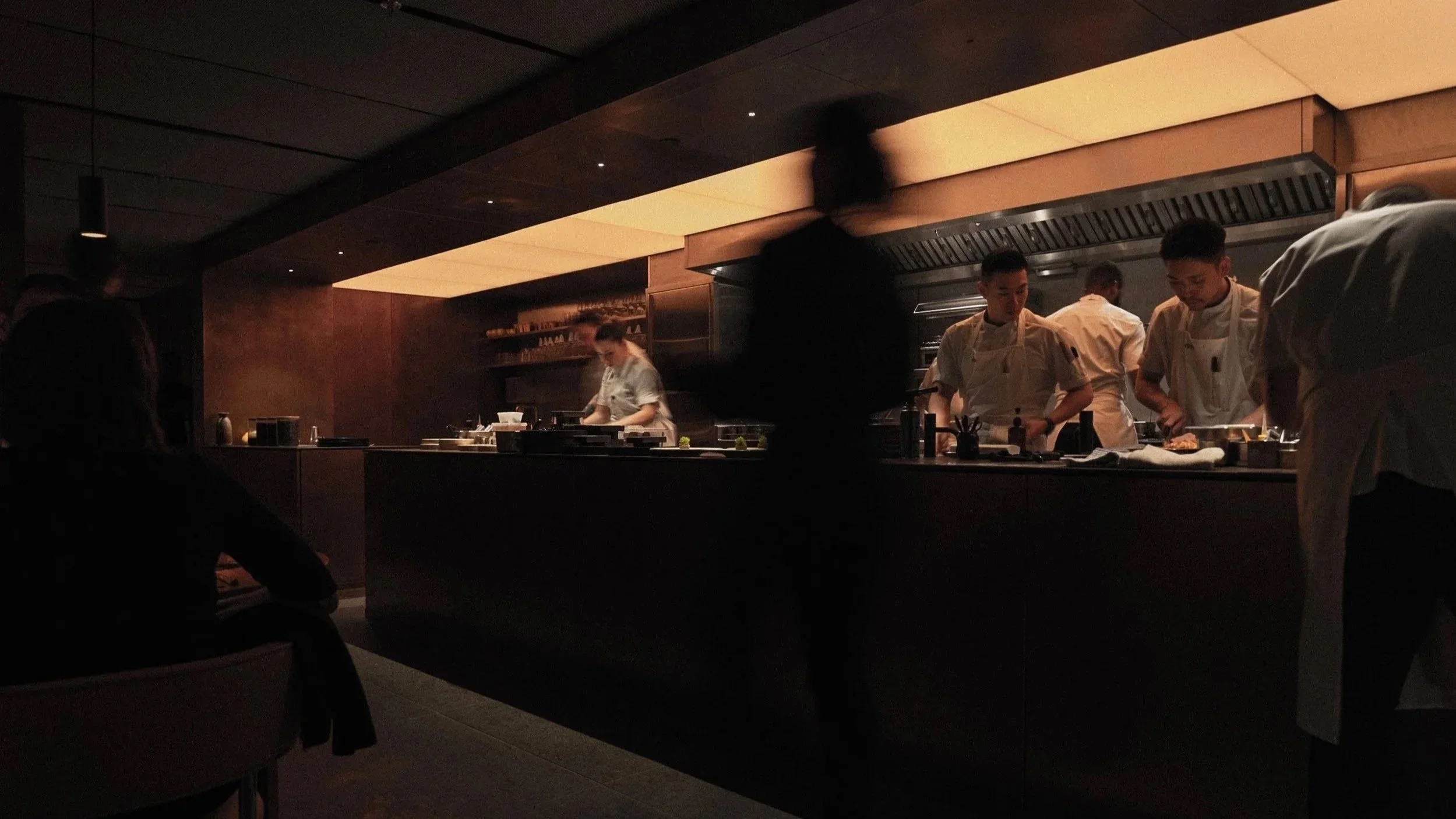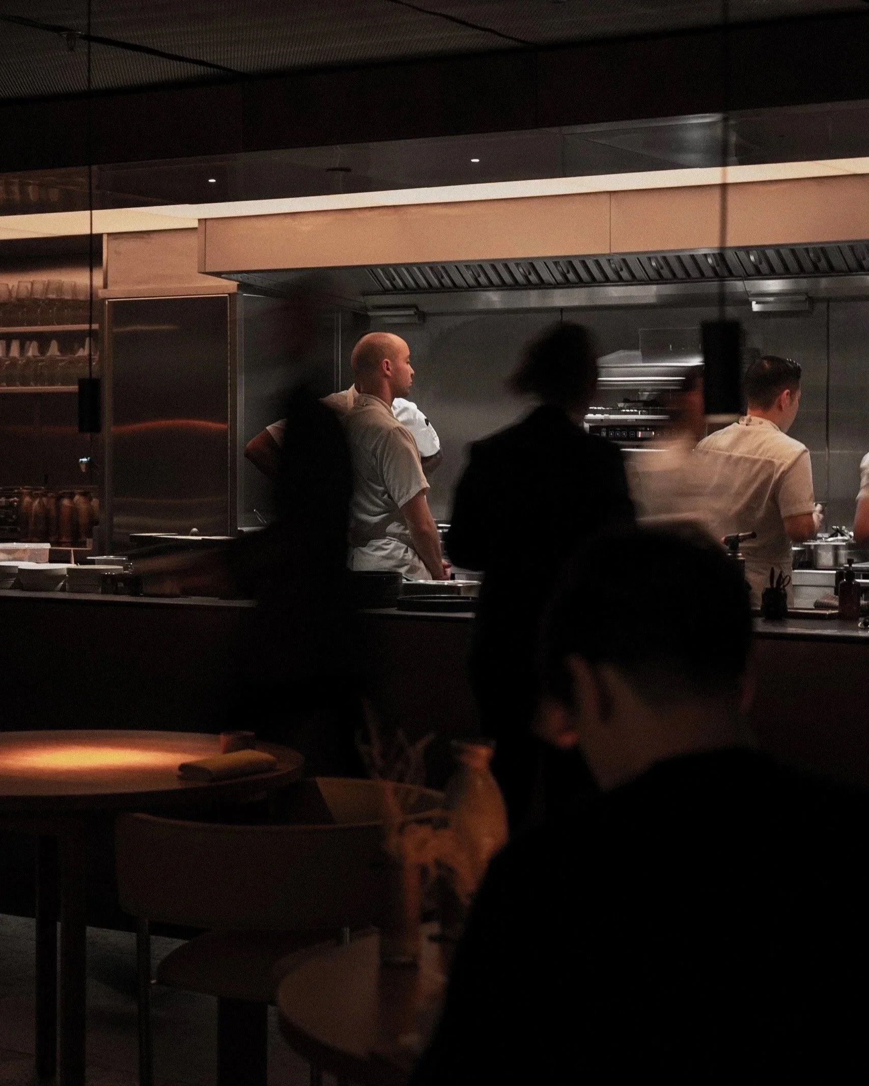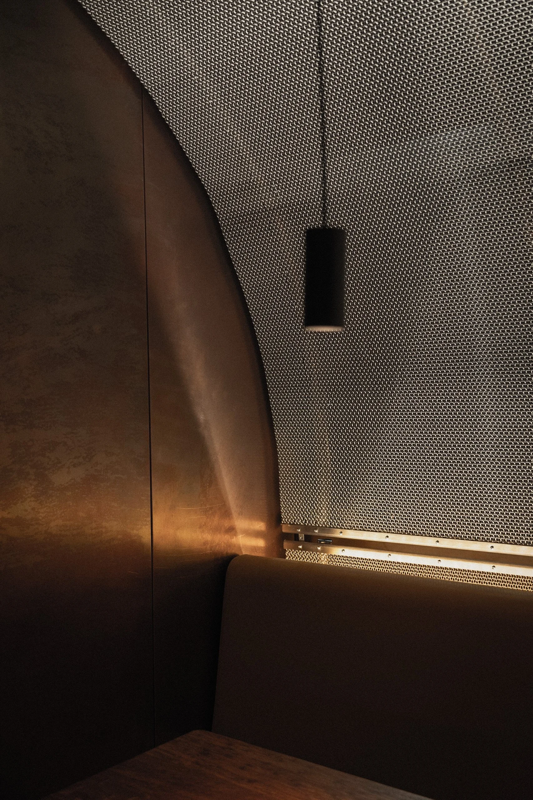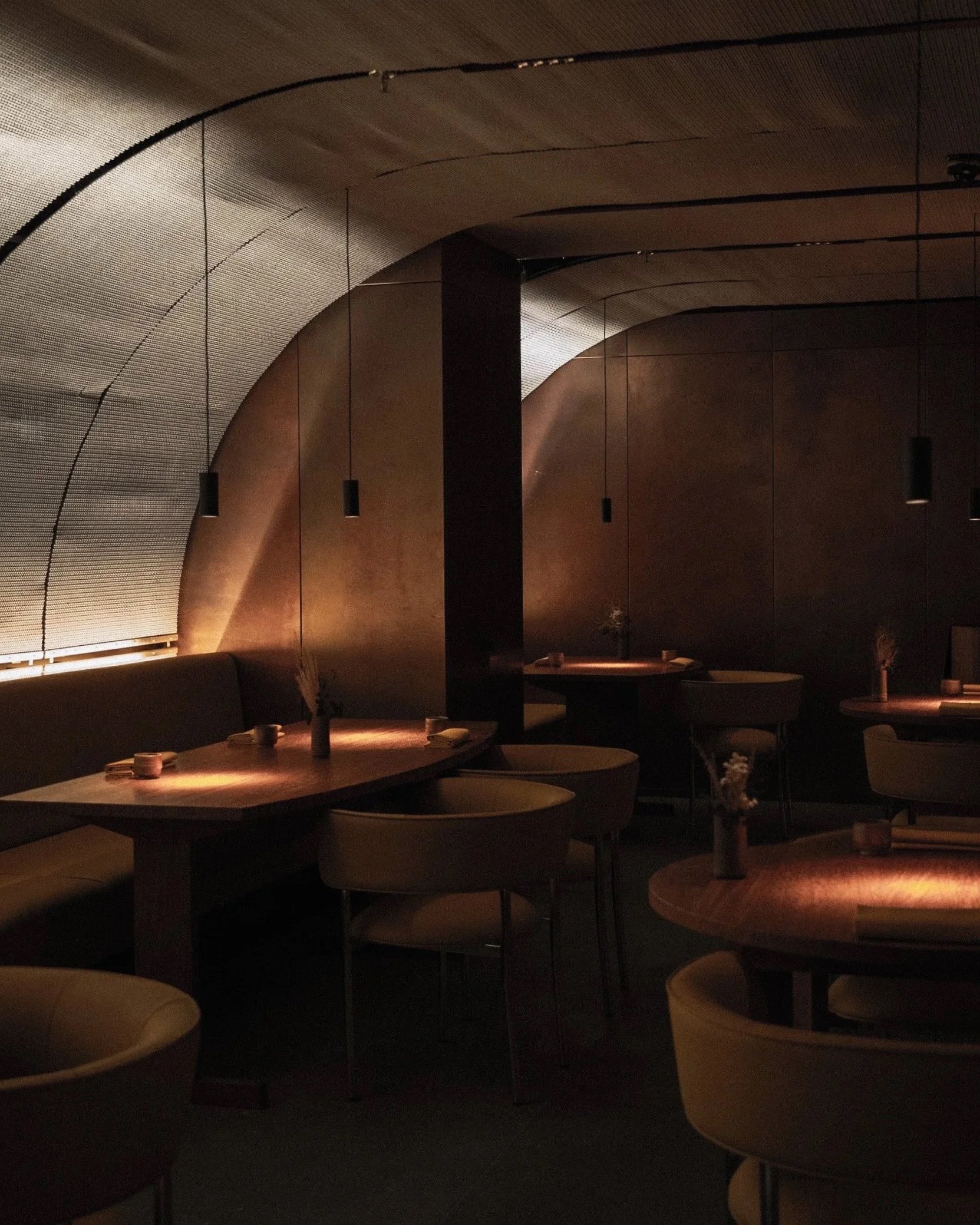 The new interiors, conceived by David Thulstrup of Studio David Thulstrup, read as a study in controlled intensity. The dining room is deliberately minimal yet materially rich, where patinated copper wall panels cast a warm, almost ember-like glow across the space. Above, a woven steel mesh ceiling stretches the full width of the room, filtering light with a subtle industrial softness. The effect is quietly theatrical. Rather than competing for attention, each surface reveals itself slowly, creating a dense, atmospheric envelope that feels both restrained and deeply tactile.