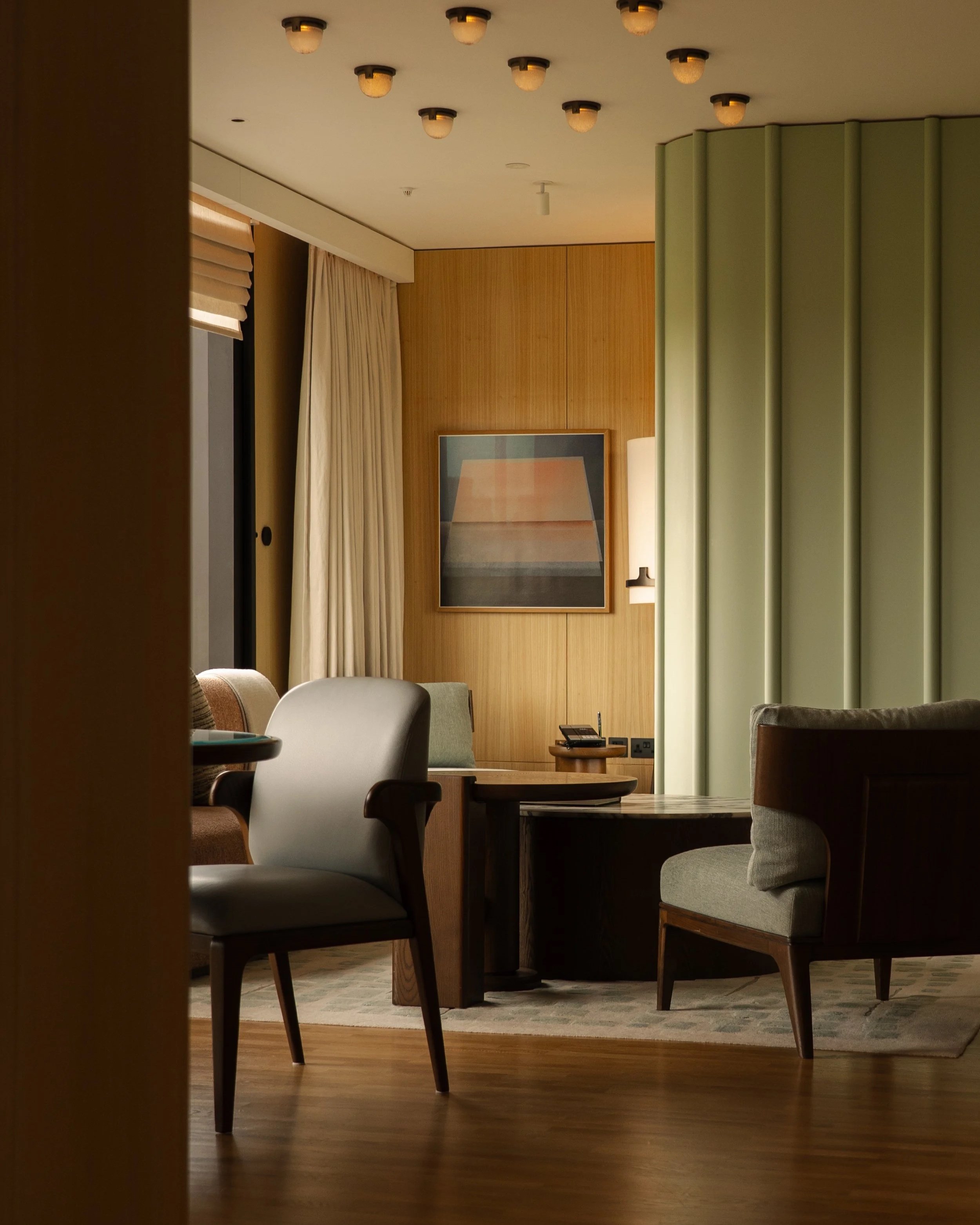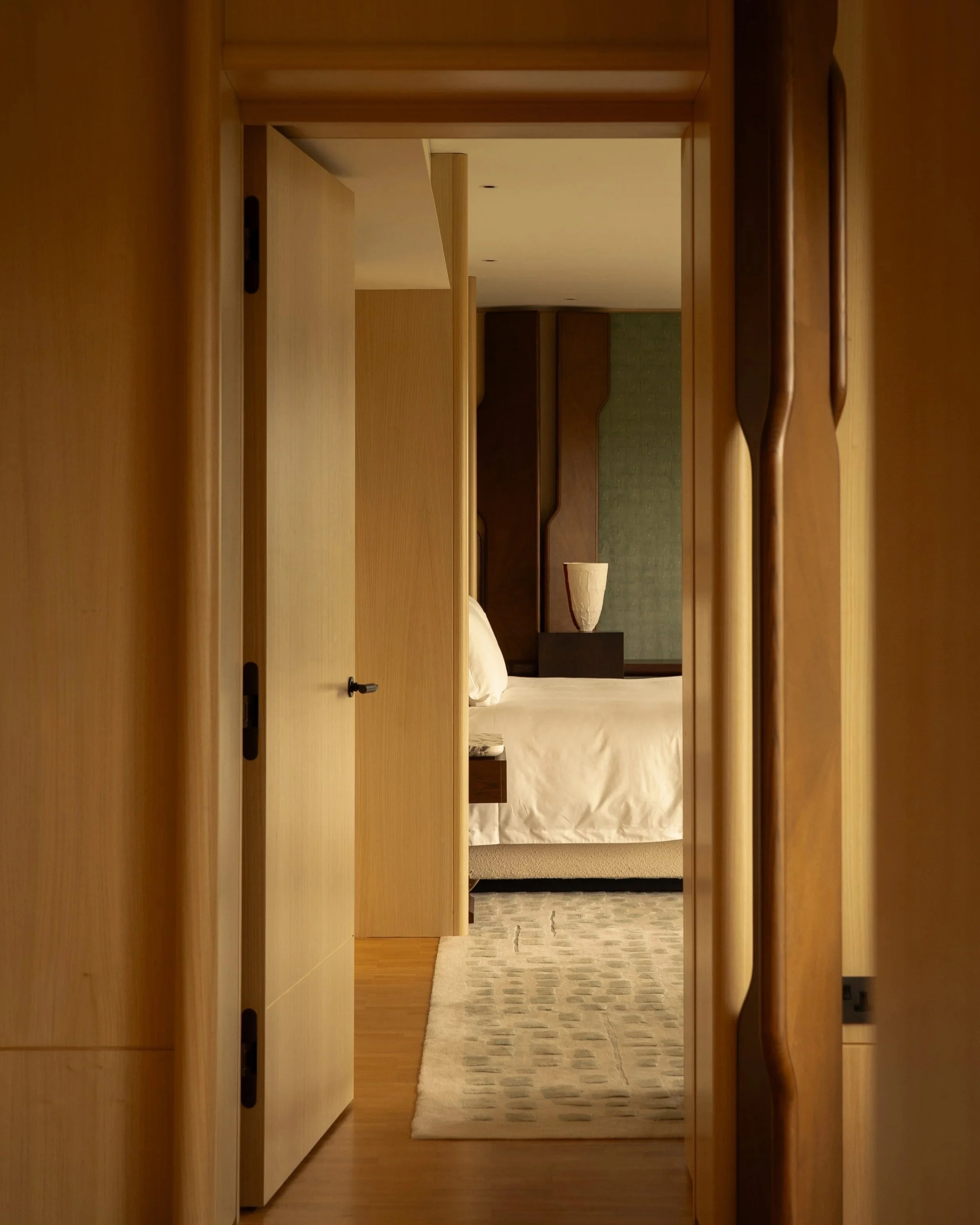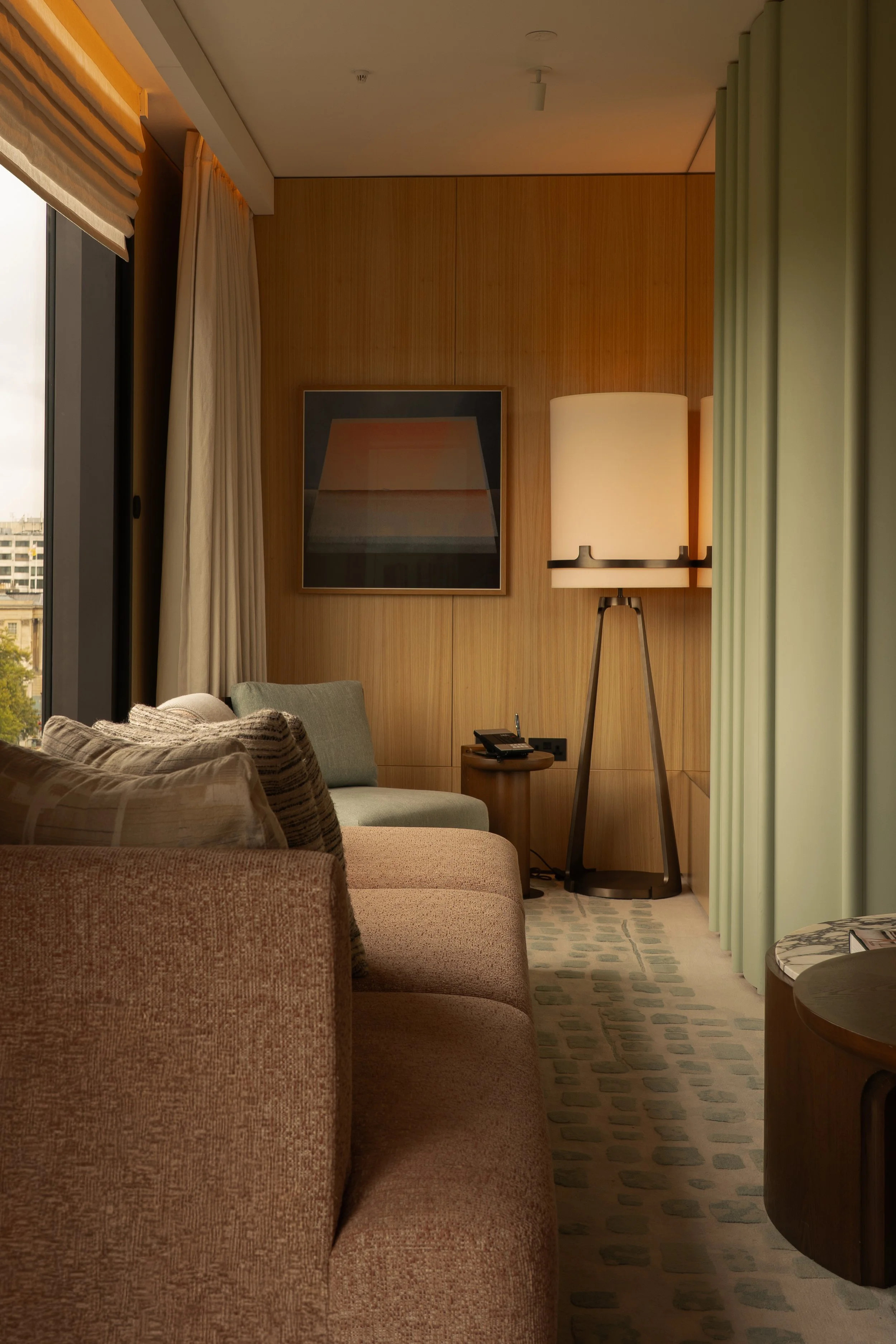 Within this precise envelope, the Park Suite by André Fu unfolds with measured calm. Fu’s approach is immediately legible: soft geometry, layered neutrals, and an almost residential sense of proportion. Where the exterior speaks in steel and glass, the suite shifts the language to tactility: brushed oak and tailored upholstery working in quiet dialogue.