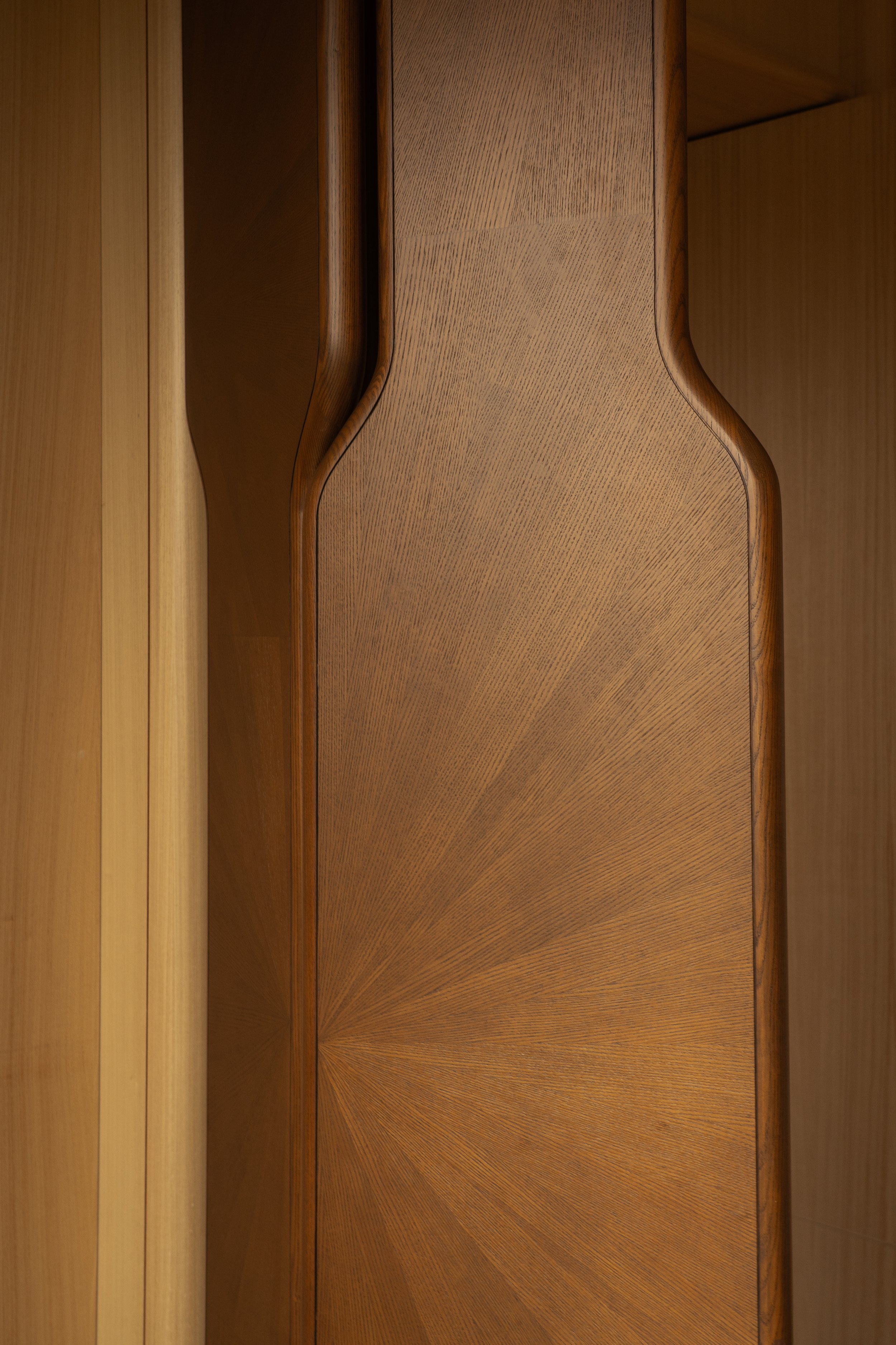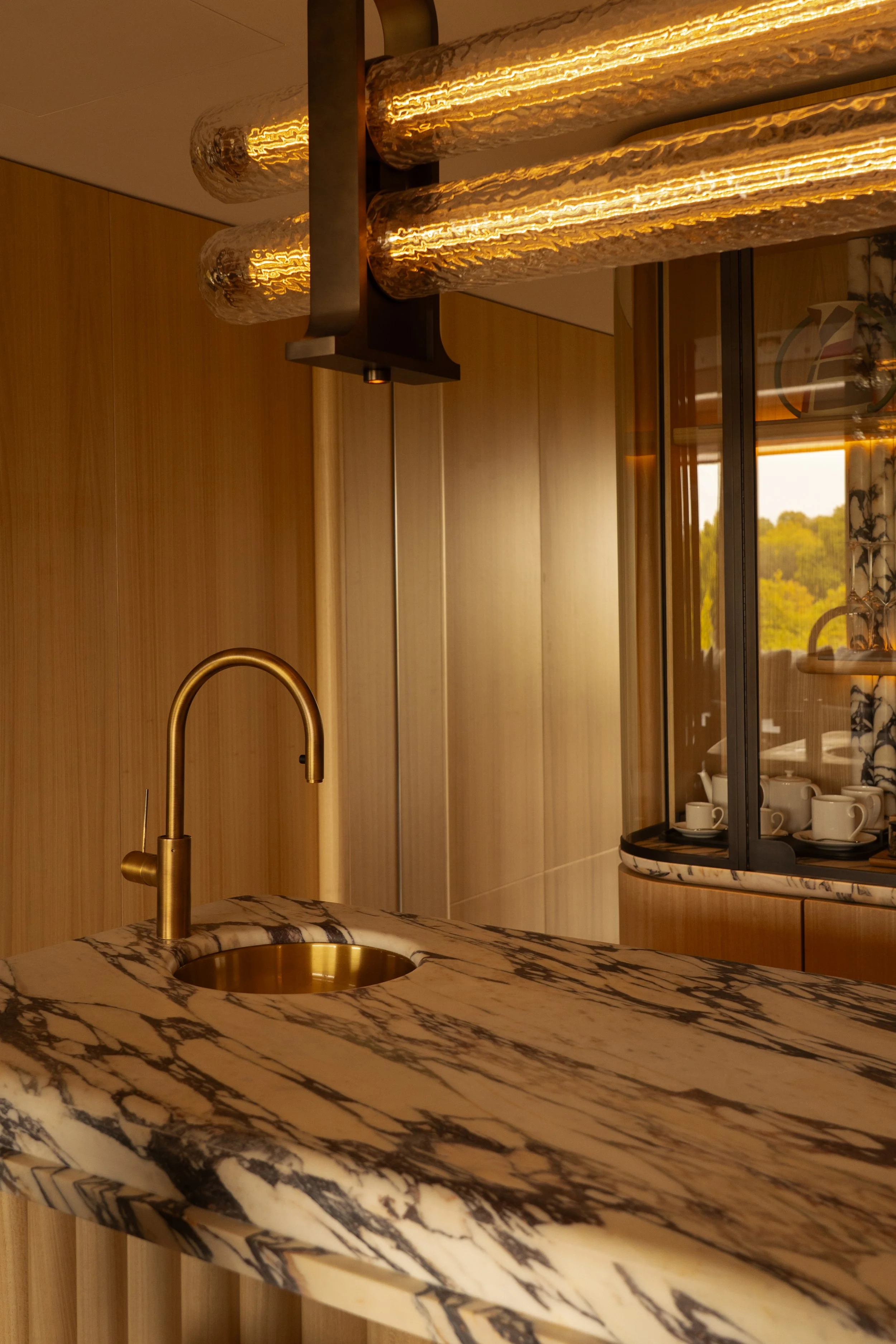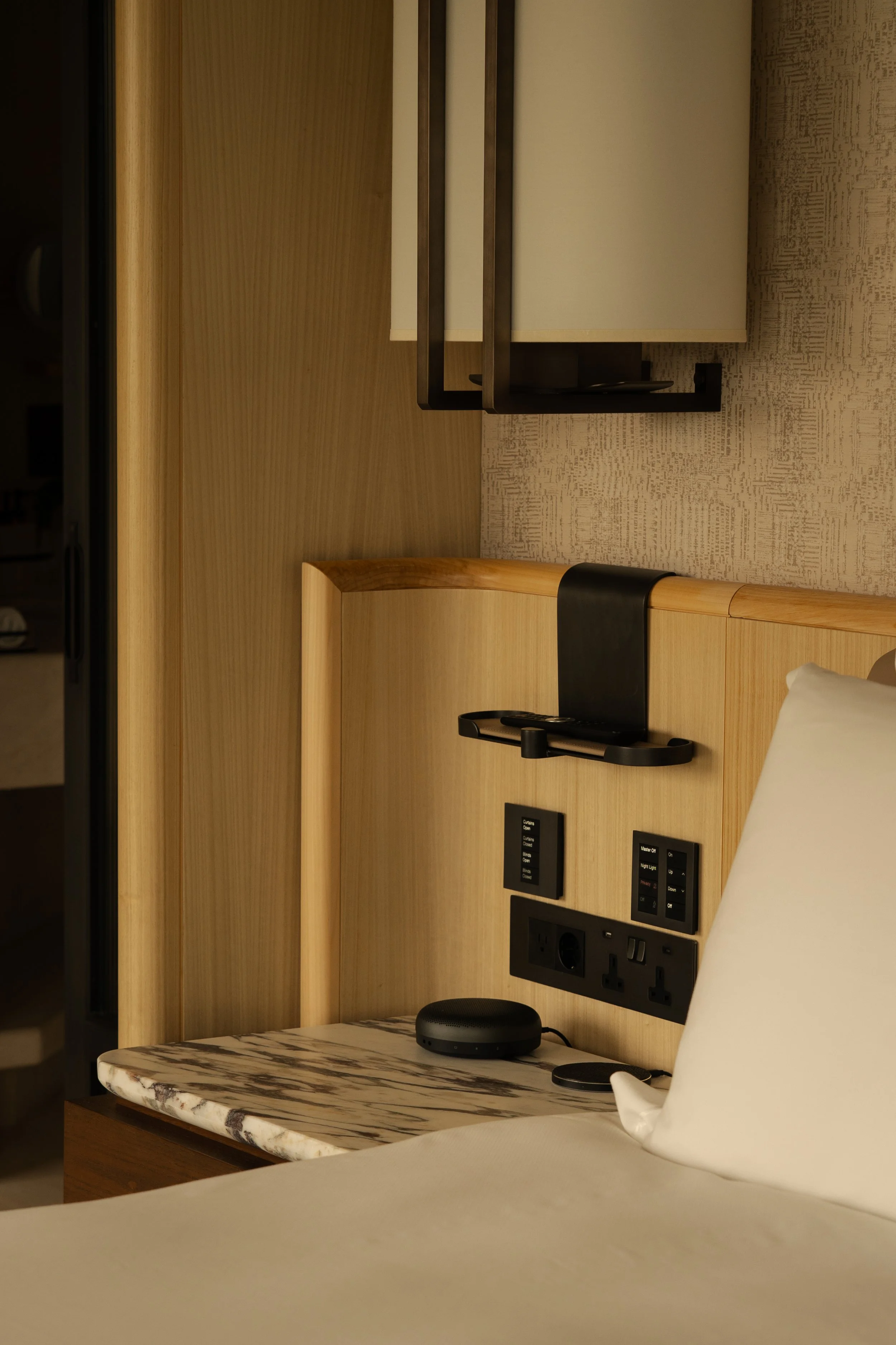 Within this precise envelope, the Park Suite by André Fu unfolds with measured calm. Fu’s approach is immediately legible: soft geometry, layered neutrals, and an almost residential sense of proportion. Where the exterior speaks in steel and glass, the suite shifts the language to tactility: brushed oak and tailored upholstery working in quiet dialogue.