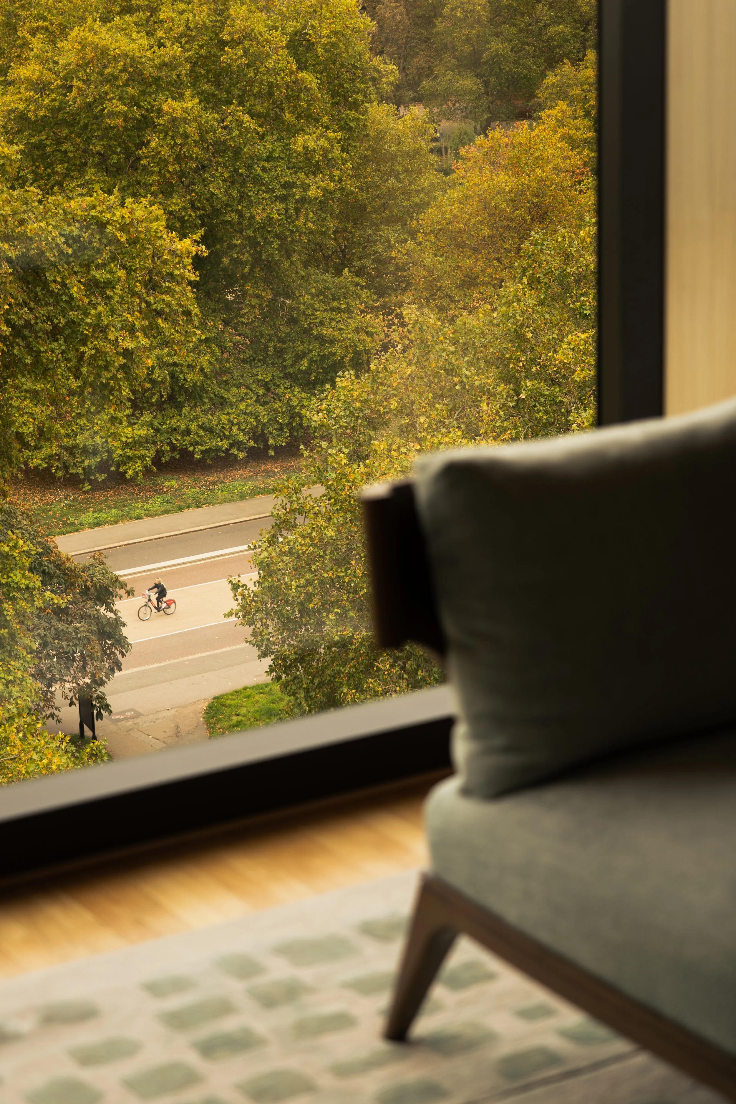 Floor-to-ceiling glazing frames the green canopy of Hyde Park, but the design resists spectacle. Instead, views are mediated through sheer layers and carefully controlled sightlines, allowing the suite to feel cocooned despite its central London position. Fu’s signature restraint is evident in the way light moves through the space: never harsh, always diffused, settling softly across surfaces as the day progresses.