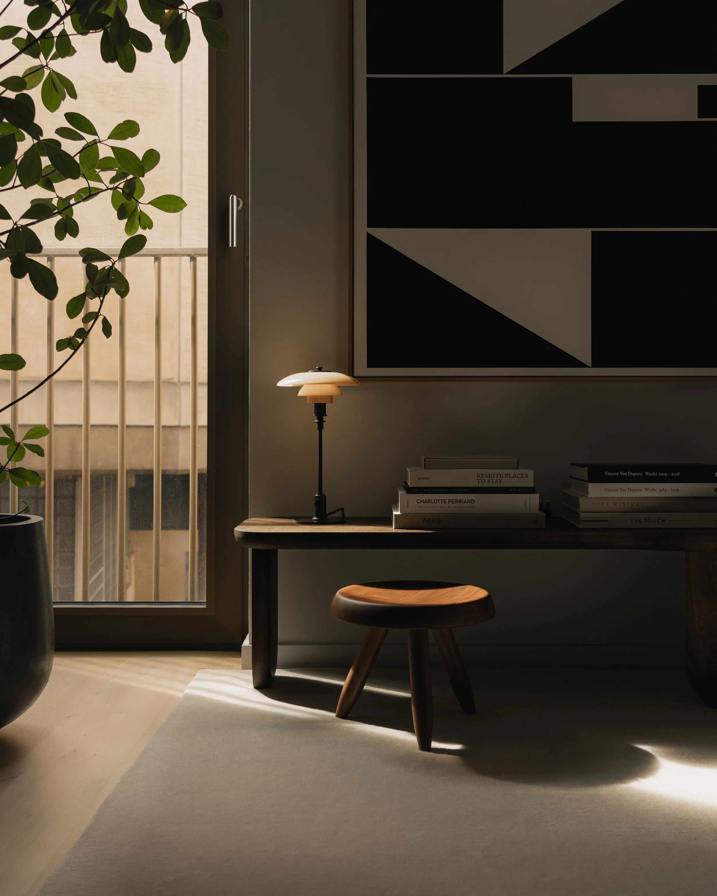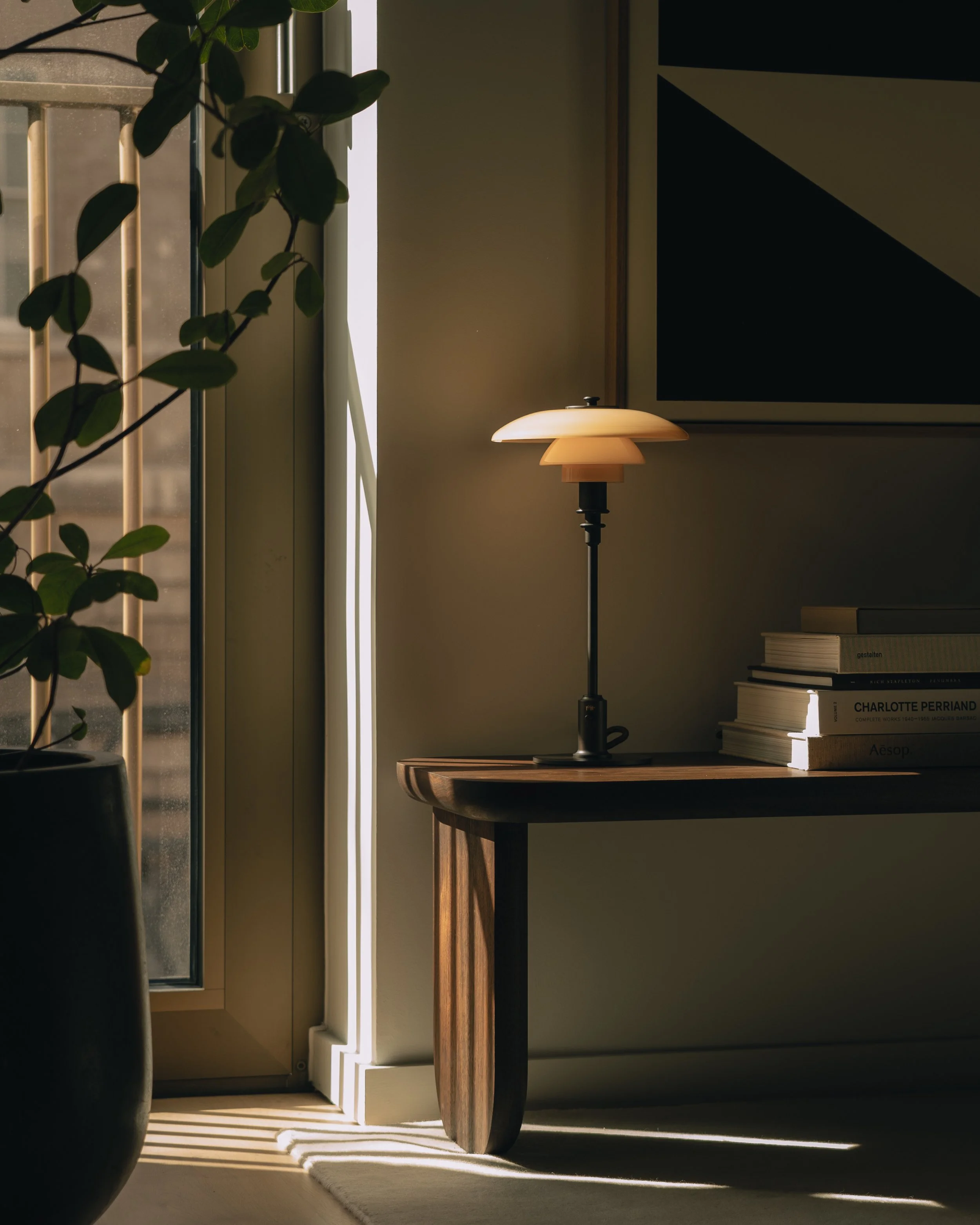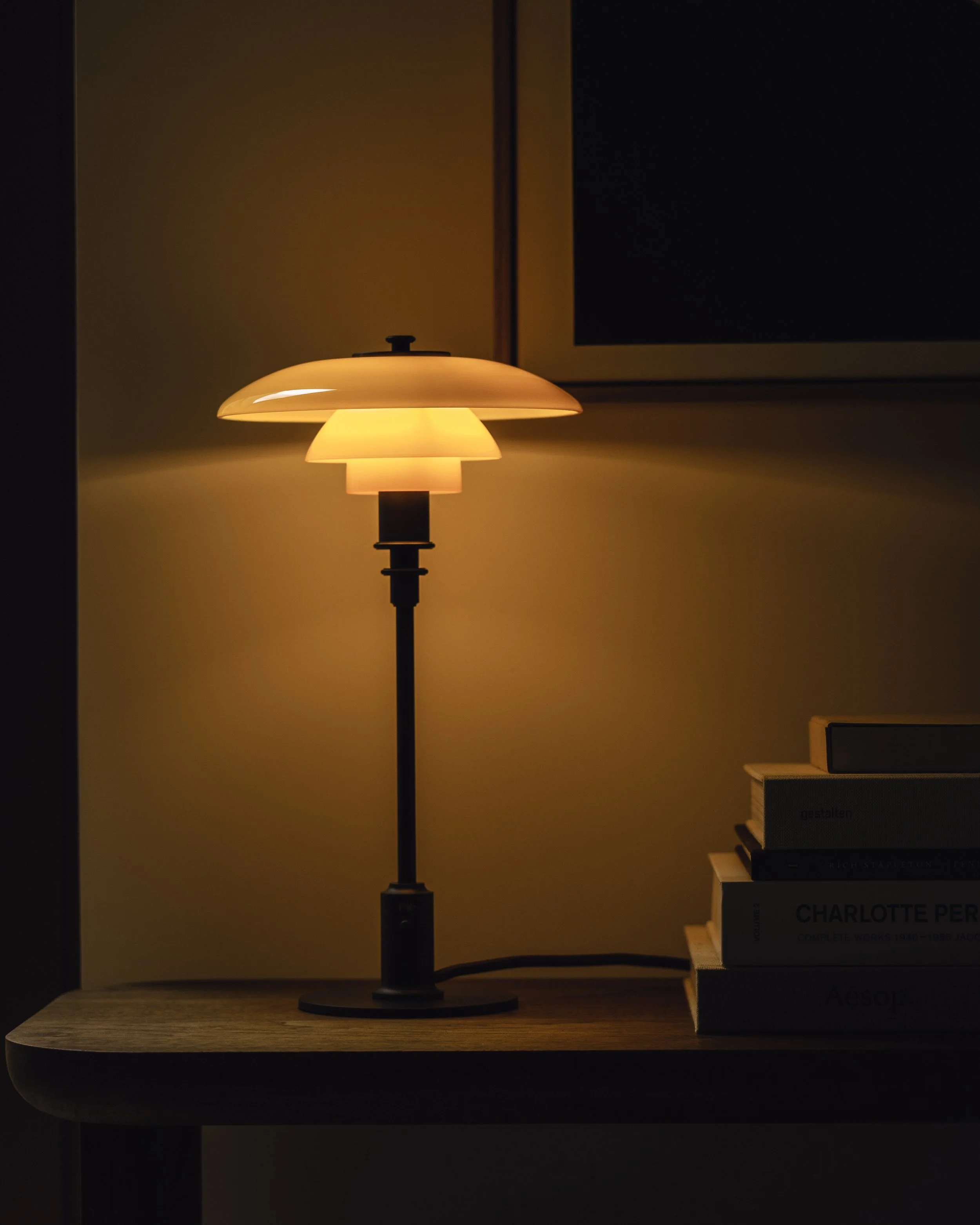 Louis Poulsen’s PH 2/1 Limited Edition revisits this legacy through a refined, collectible iteration. Petite in scale, the 2024 edition features mouth-blown, four-layered terracotta glass shades paired with lacquered aged brass, each stem delicately engraved with Henningsen’s initials, P.H, a detail reserved exclusively for annual limited releases. Subtle variations in the handmade glass lend individuality to every piece, while the treated brass base offers a considered patina that remains constant over time. It honours the designer’s original 1930s forms while introducing a warmth distinct from the classic white opal editions.