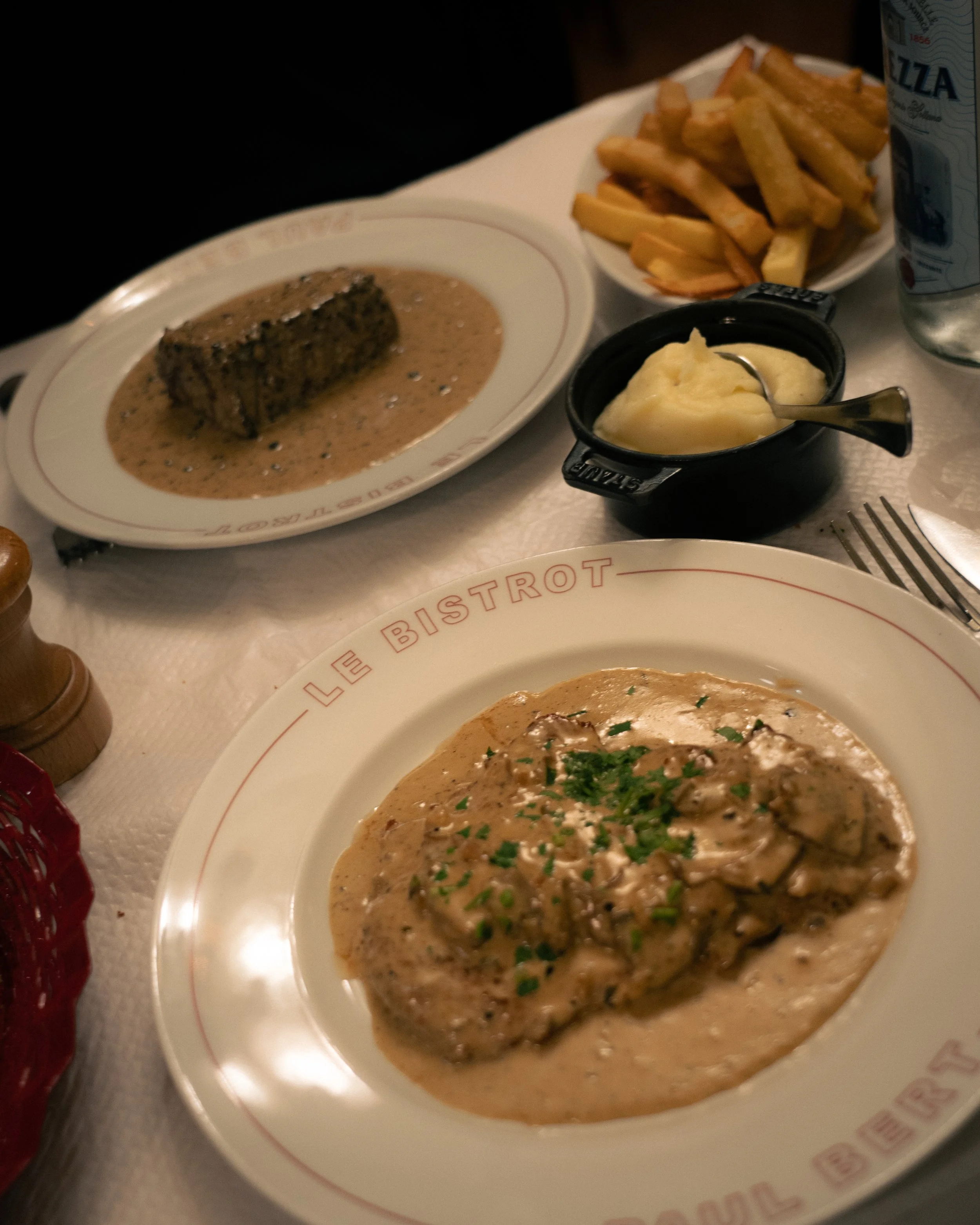 Stepping outside, Paris resumes in layers. A visit to Ogata in the Marais offers a moment of stillness within the city’s pulse. In the tea salon, hojicha is roasted before us, its aroma warming the room as mochi and authentic small bites arrive with quiet ceremony. We leave with practical souvenirs, footed bowls in deep red ameyu glaze and a selection of teas, to carry the memory home. Memorable meals anchor the days. At Le Bistrot Paul Bert, the filet de boeuf with fries arrives exactly as it should, unapologetically classic deep with flavour. Parcelles, tucked between Arts et Métiers and the Centre Pompidou, delivers pressed pork shank and dark chocolate pecan tart beneath gilded ceilings and vintage tiles, a scene lifted from another era yet entirely present.
