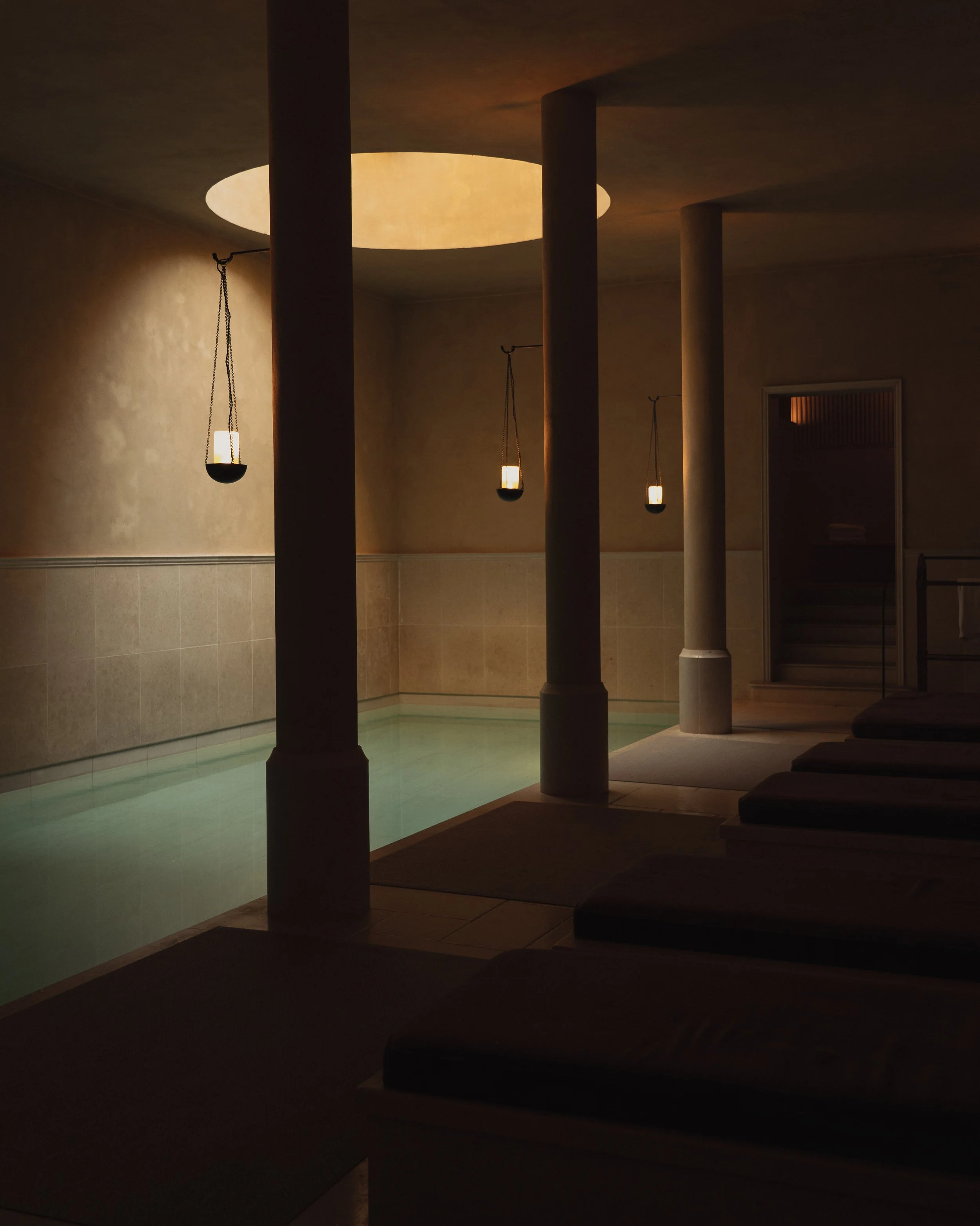 Slow mornings are essential here. Breakfast is simple yet deeply considered: fresh eggs, bread baked in-house, pressed juices, and housemade preserves. We linger longer than intended before descending into the Roman-inspired baths. Caldarium, tepidarium, frigidarium, a sequence of a thermal bath and pool circuit that feels almost ceremonial. Light filters from above, water reflecting softly against limestone columns. The space is moody and hushed, a subterranean counterpoint to the Mediterranean sun.