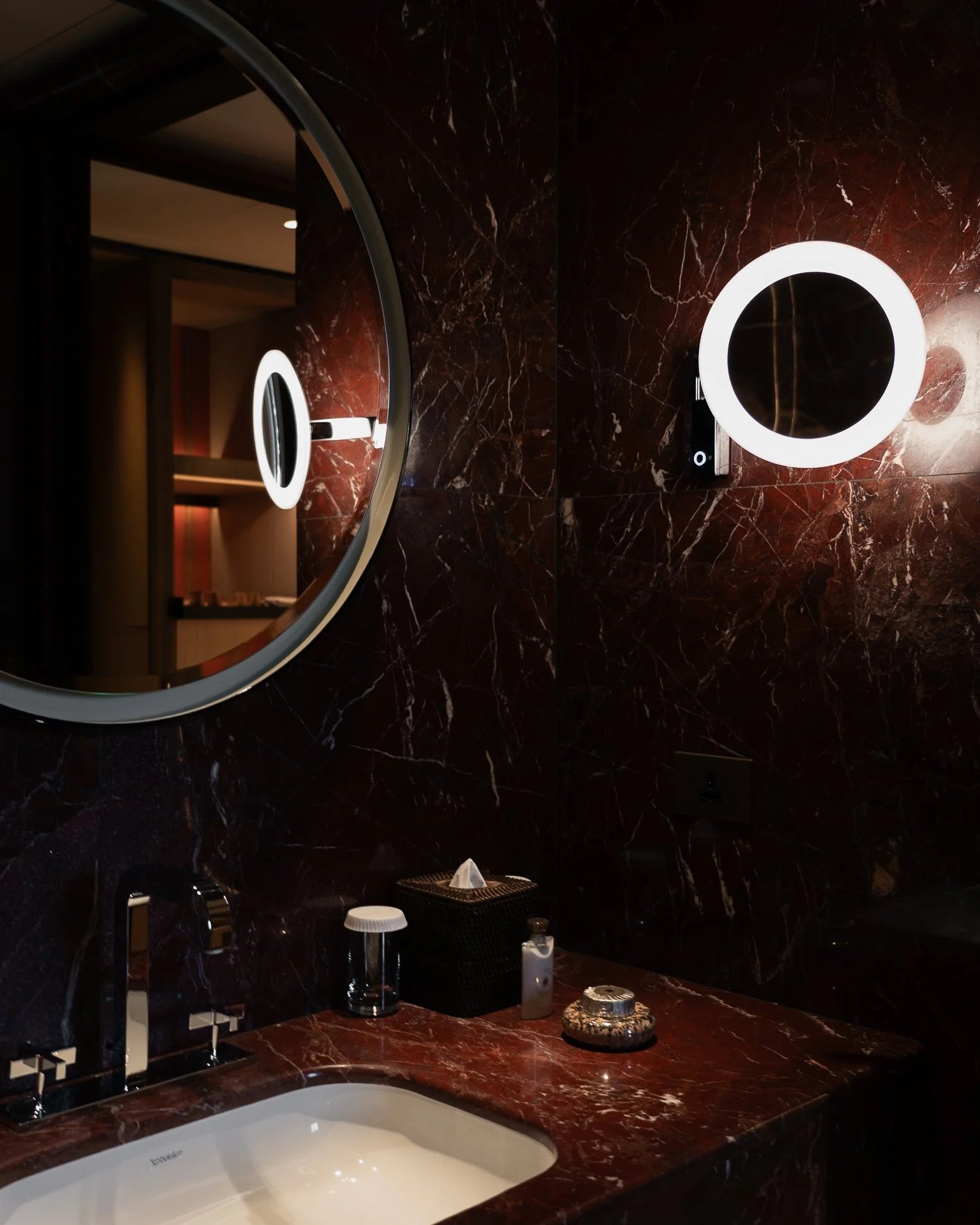 Inside, the mood shifts to something more intimate yet equally deliberate. Guest rooms are composed with Bvlgari’s characteristic precision, where warm woods and tailored lines create a sense of calm enclosure. The bathrooms, however, are the quiet revelation. Clad in richly veined red jasper, they glow with a depth that feels unmistakably Roman, echoing the city’s terracotta tones and sun-warmed stone. Morning breakfast taken in-room becomes a ritual in itself, the table set simply against a window framing Rome’s layered skyline, where domes and rooftops soften into the distance.