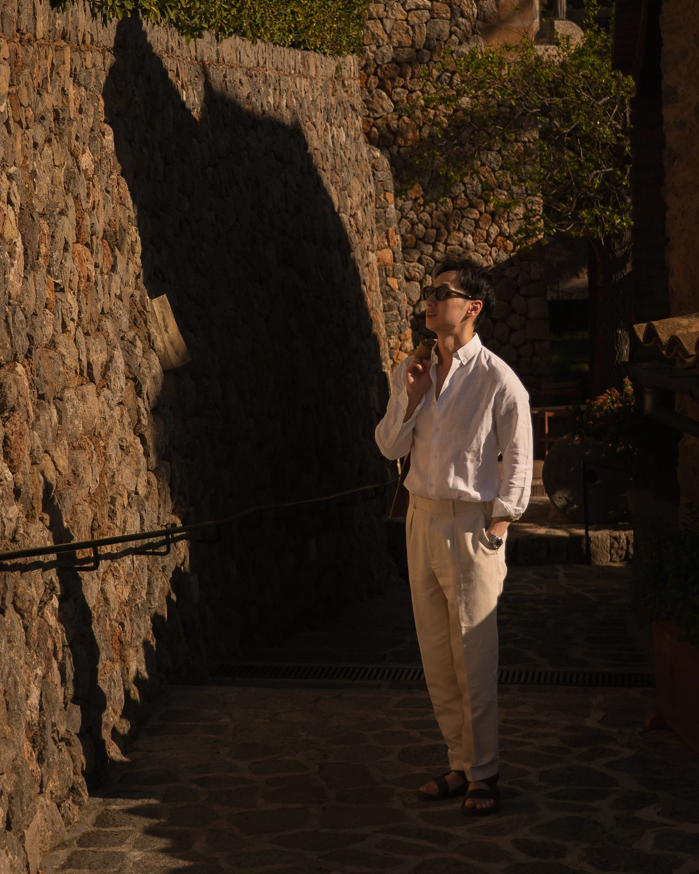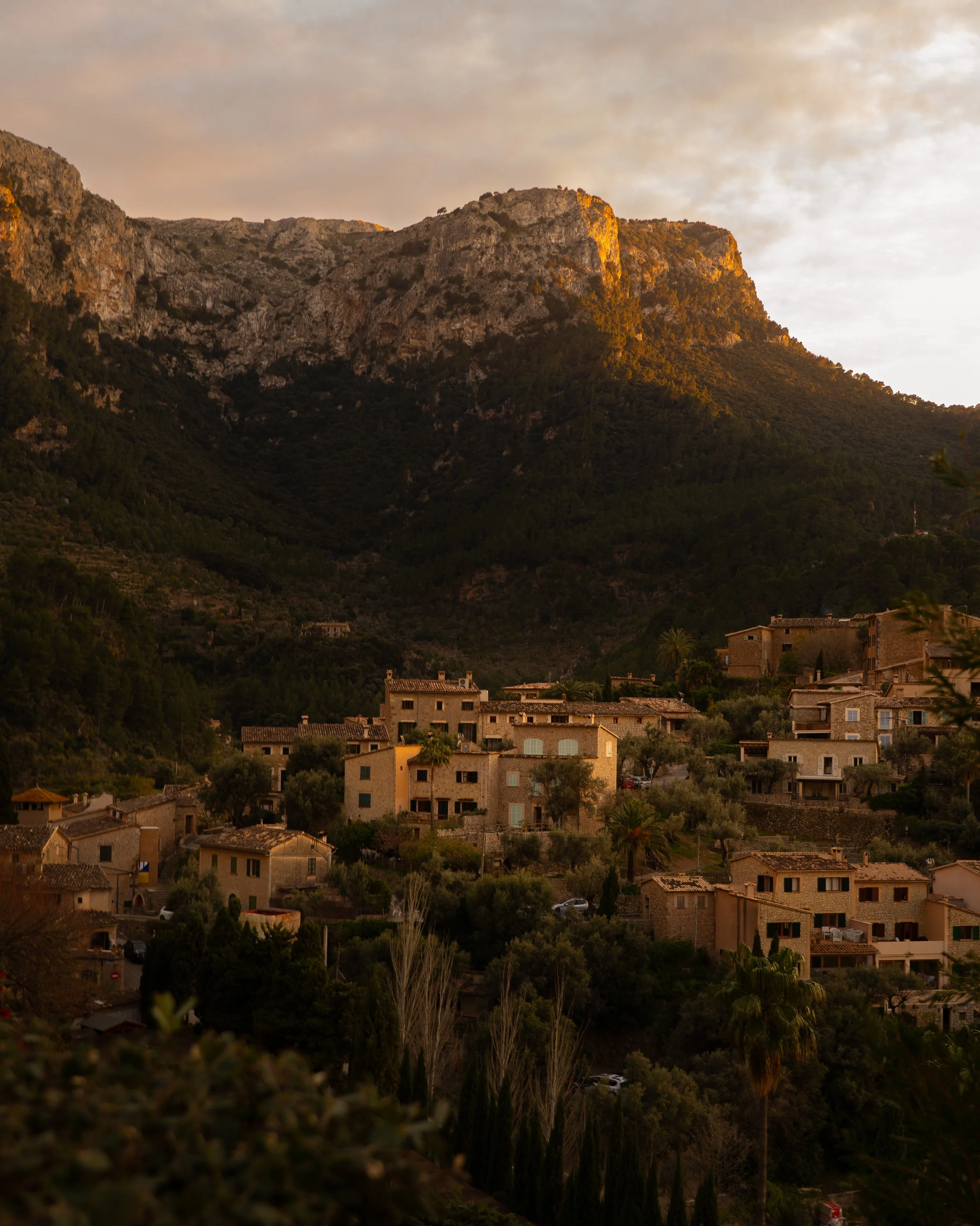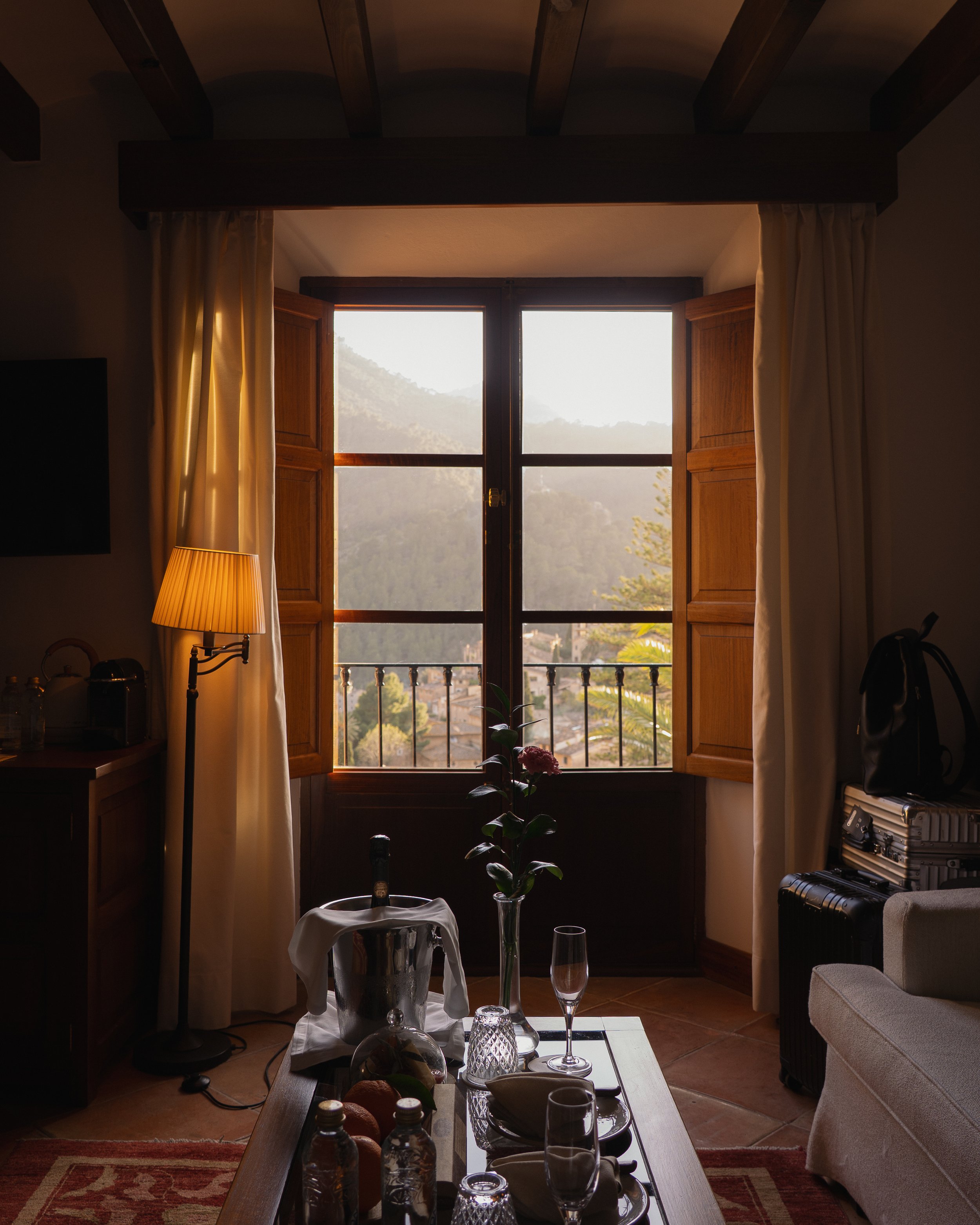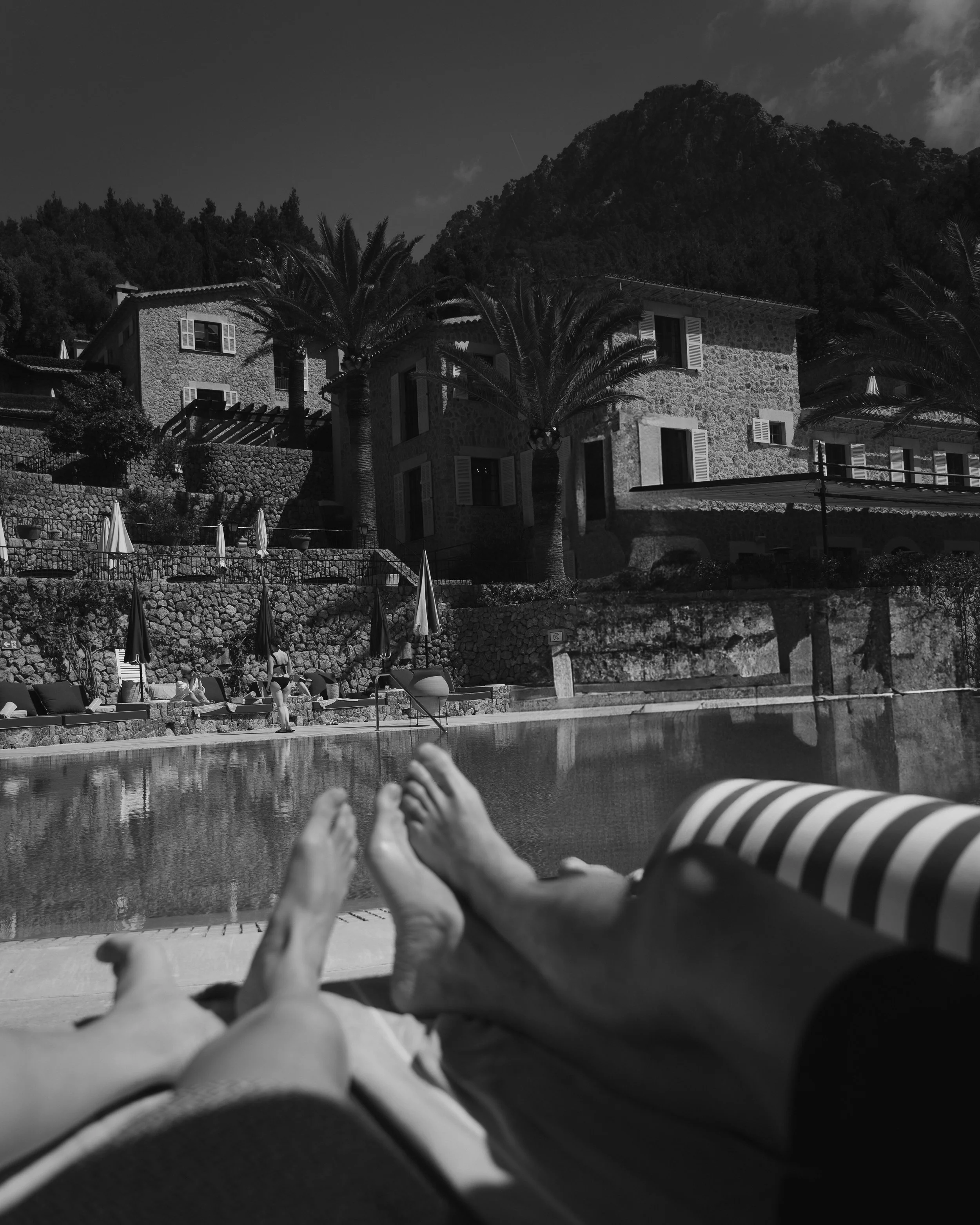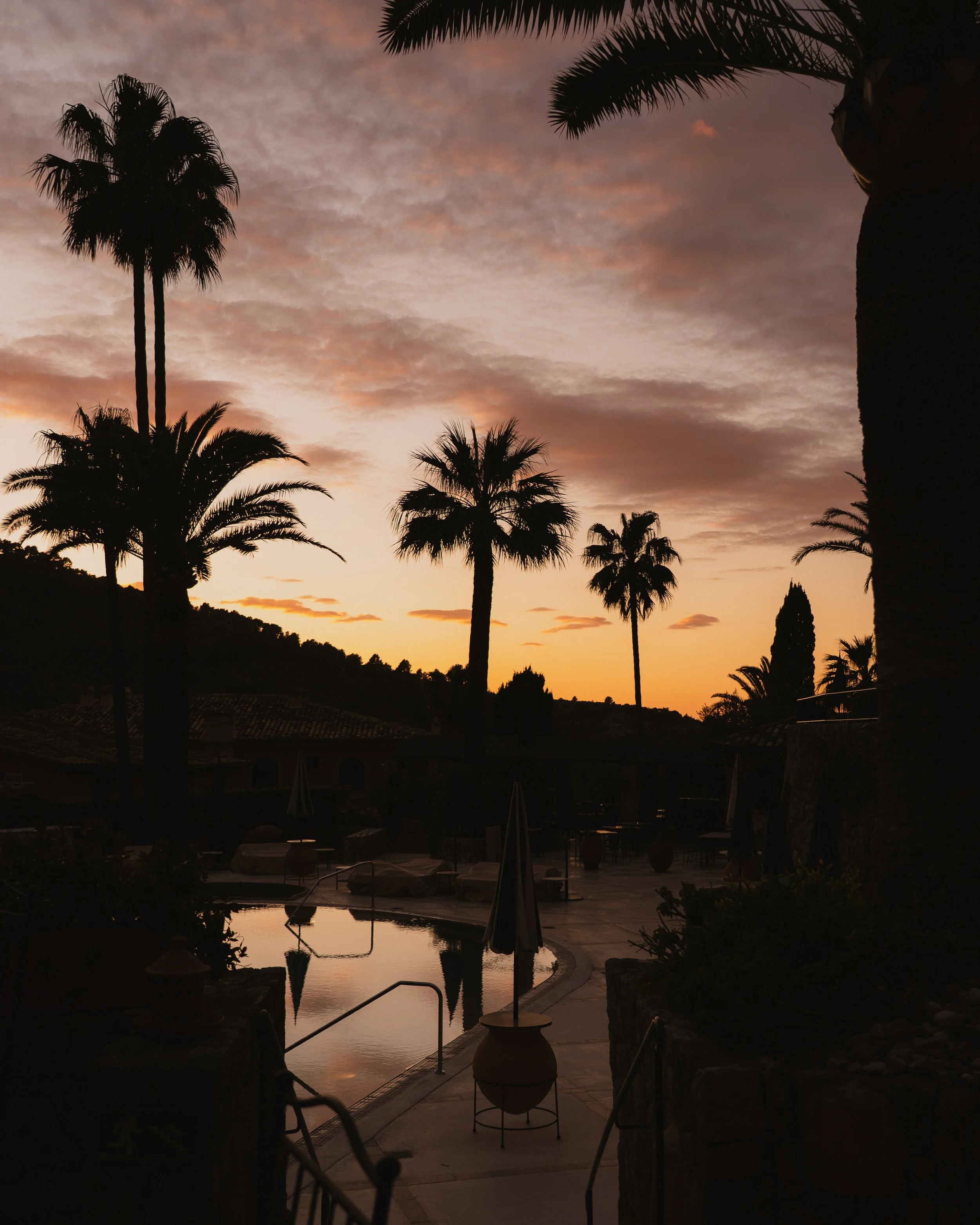 As the days stretch, the rhythm settles. By afternoon, the pool sits suspended between palm and mountain, the Tramuntana rising in quiet command beyond it. Birds chirp close by, hopping nearer without hesitation, emboldened by the promise of crumbs. They linger at the edge of loungers and low tables, unafraid, part of the gentle theatre of the afternoon. Drink in hand, hours pass without measure, marked only by the slow shift of light across honeyed stone. Warmth lingers long after the sun dips behind the peaks. In Deià, time loosens, and the Mallorcan dream draws you into its cadence; mountain, palm and sky all moving in quiet accord.